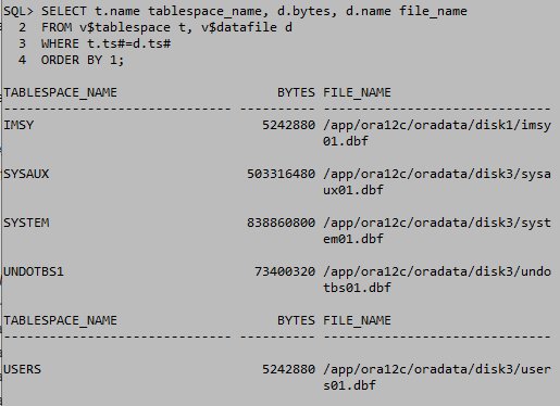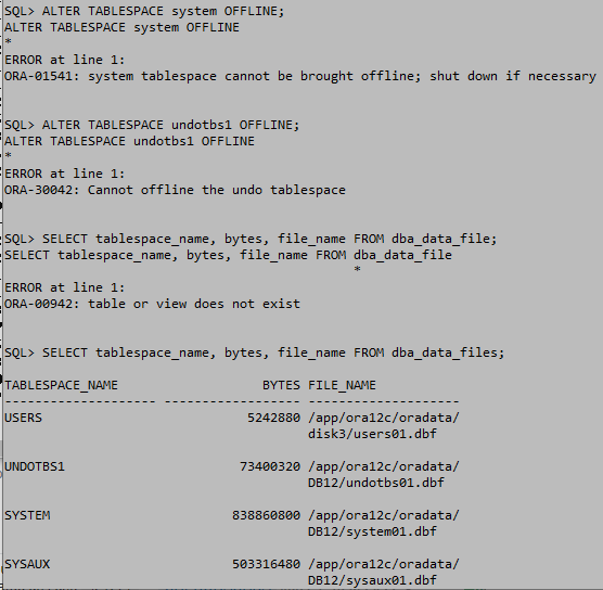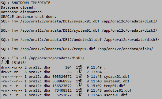 이 상태에서는 테이블스페이스를 offline으로 변경하여 작업을 수행한다. 당연히 사용자가 임의로 사용이 불가능한 SYSTEM이라는 이름의 테이블 스페이스와 실행취소 세그먼트가 있는 테이블 스페이스, 기본임시 테이블 스페이스는 offline 작업을 할 수 없다.