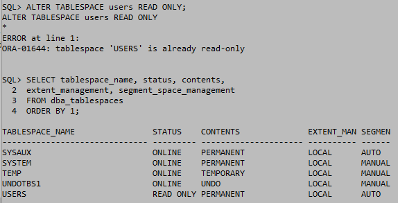 offline으로 설정하는 것은 'ALTER TABLESPACE 테이블스페이스명 OFFLINE;'을 사용한다. 이렇게 되면 해당 테이블 스페이스는 mount의 상태가 되어 테이블스페이스에서의 작업이 가능해 진다. online으로 설정하면 'ALTER TABLESPACE 테이블스페이스명 ONLINE;'을 사용하면 되며, online으로 상태를 변경하기 전에 변경사항을 제대로 수행해야 한다.