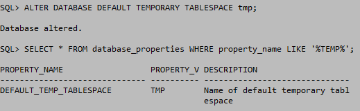 기본 임시테이블 스페이스는 offline으로 변경 및 제어를 할 수 없다. 임시 테이블 스페이스를 지정하지 않게 되면 기본 임시테이블 스페이스를 사용한다. 기본 임시 테이블은 오라클이 설치될때 자동적으로 생성되는 테이블 스페이스 이다. 데이터베이스의 기본 임시 테이블 스페이스를 찾기 위해서는DATABASE_PROPERTIES를 참조한다.