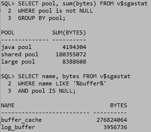 SHOW PARAMETER sga_ 에서 sga_max_size의 용량은 v$sgastat에서 나오는 java pool, shared pool, large pool, buffer_cache, log_buffer의 합보다 크다. 왜냐하면 v$sgastat의 합은 최소한으로 사용하기위해 미리 확보한 크기고, sga_max_size가 용량의 한계이다.
