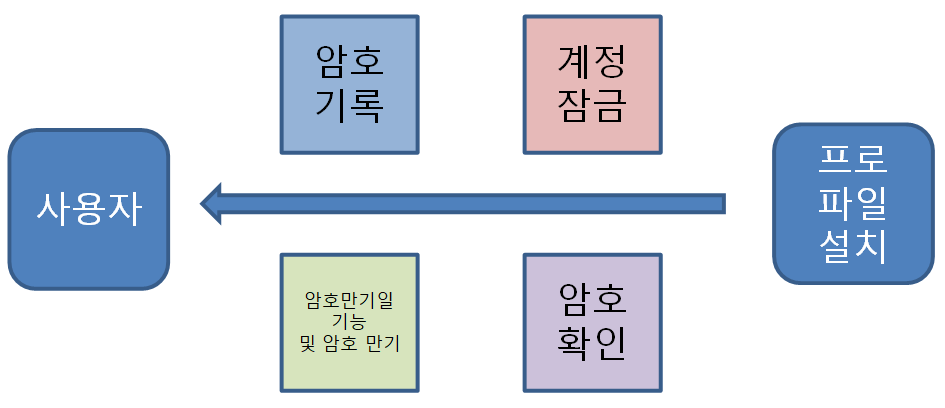 암호에 관한 정책은 크게 4가지가 있다. 암호기록, 계정잠금, 암호 만기일 기능 및 암호 만기, 암호확인이 있는데 암호기록과 계정잠금 중 하나만 설정을 해주어야 한다. 둘다 설정하게 되면 서로 간섭이 일어나 설정값이 적용됬다 안됬다 한다. 계정잠금은 password 몇회 오류시 lock이 걸림에 대한 설정을 하는 것인데 실무에서는 사용하지 않는다. 왜냐하면 어플리케이션에 계정명과 password가 지정되어 입력하지 않기때문에 오류가 생길수가 없다. 이 설정을 사용하는 이유는 외부에서 접속하여 데이터 유출 등을 방지하기 위해서 사용한다.